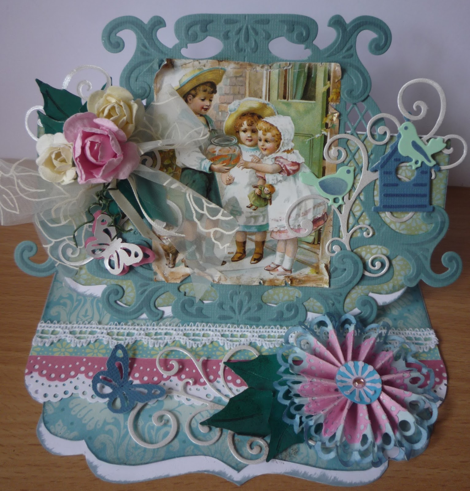 Mijn kaart heeft ook een nostalgisch lentesfeertje met drie kindjes die genieten van de visjes in de kom. De basis van de kaart heb ik gemaakt met een grote stans van Tim Holtz. Deze aan één kant dubbelgevouwen zodat het een easelkaart werd en toen met 3 uitgestanste vormen (van een standaard van Marianne Design) de opstaande kant beplakt. Hierop kwam het plaatje dat ik al heel lang heb, een krul van Joy!, vogeltjes van MD en een rozet die ik zelf gemaakt heb. Ik heb met een randpons één kant van een strook papier geponst, alles zigzaggend opgevouwen en als een cirkel in elkaar gezet. Het dessinpapier is van Basic Grey.