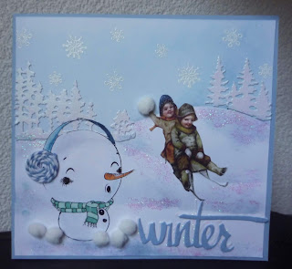 Well, slowly winter is on it's way and last week we had some frost during the nights. So it is time for making wintercards (and I also use them as christmascards!). I started with the digi from the sponsor for the new challenge from http://scrapping4funchallenges.blogspot.com and the theme this time is Winter! I made the earwarmers from the snowman with bakerstwine. I added some trees from Marianne Design and a very old image out of my stash to make the scene complete.